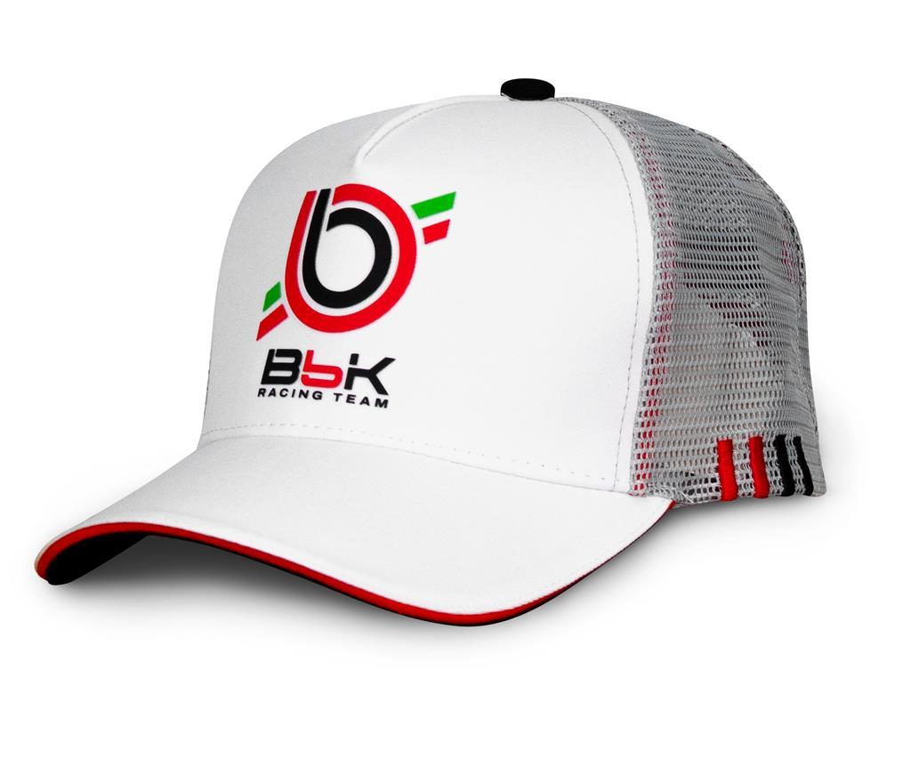 Five panel peak cap with a grey mesh backing featuring the 3D printed BbK Racing Team logo on the front on a white background.