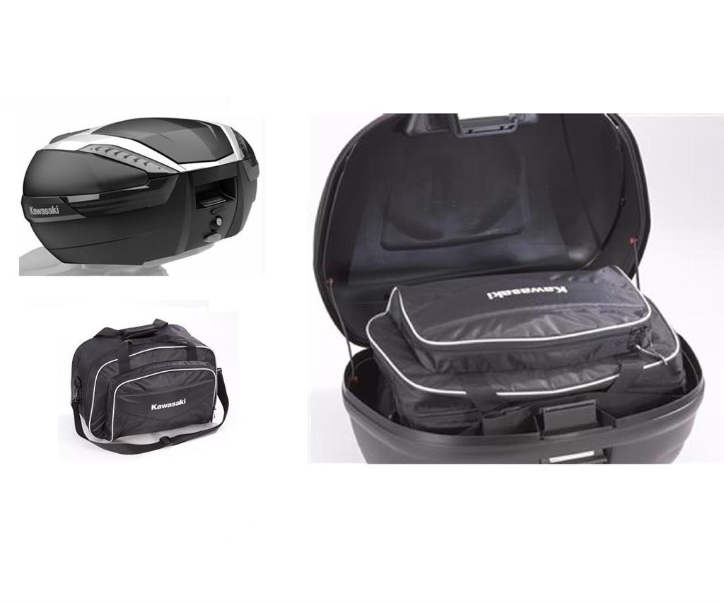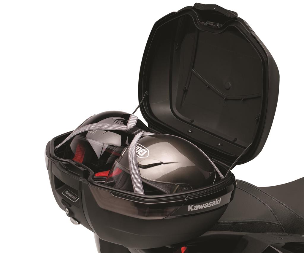 Top case providing a spacious 47 litres of storage space while the bracket features a lateral meovement damper. Accepts two full face helmets from most manufacturers. Matching cover in bike colour to be ordered separately, plus an anodized aluminium deco plate in a choice of silver or black.